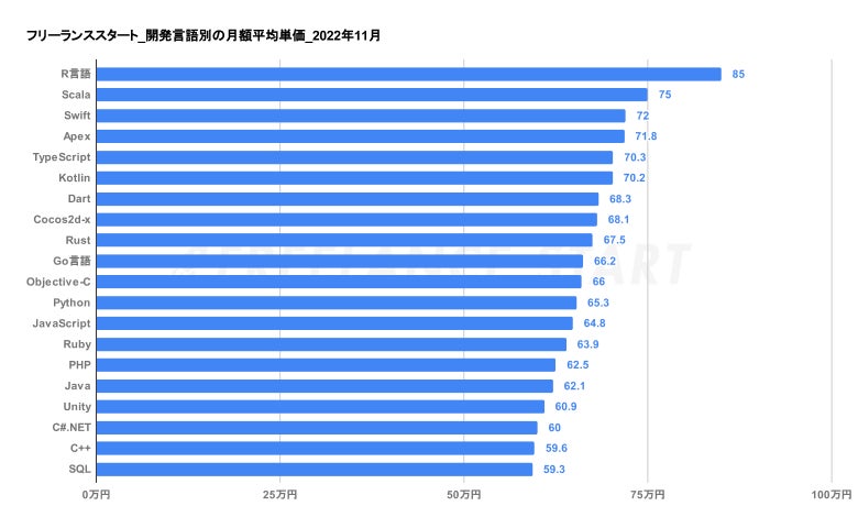 下記画像は、フリーランススタートが分析した、言語別の平均単価です。